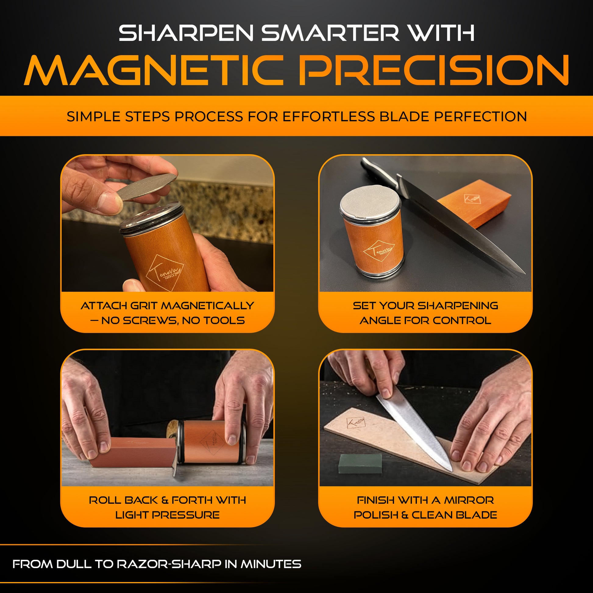 Engineered with a smooth rolling mechanism and magnetic disc system, this sharpener allows you to swap grits instantly with no screws, tools, or setup required. Just roll and sharpen with precision.