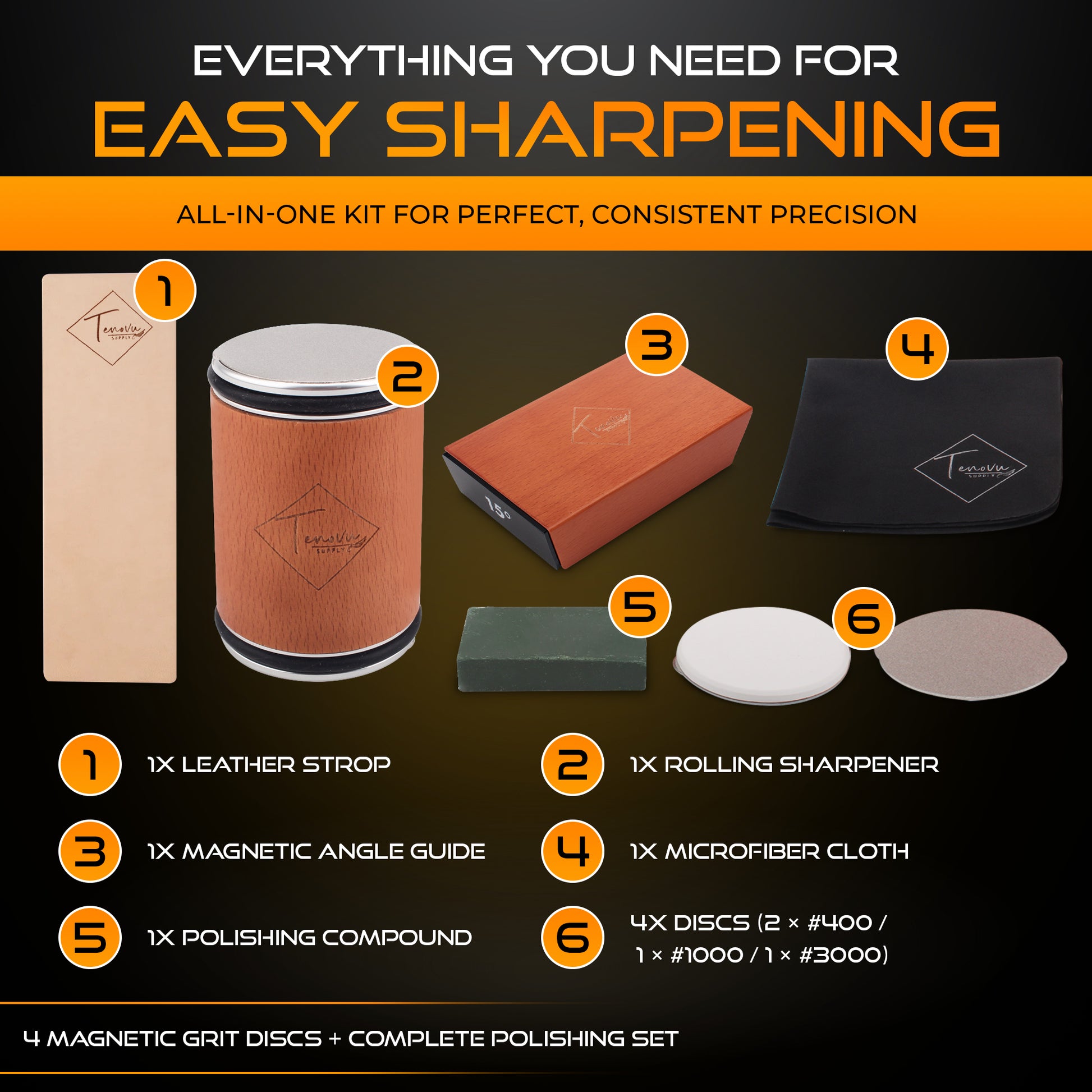 Upgrade your kitchen tools with the Tenovu Supply Rolling Knife Sharpener Kit and enjoy sharper knives with less effort, every time you cook.