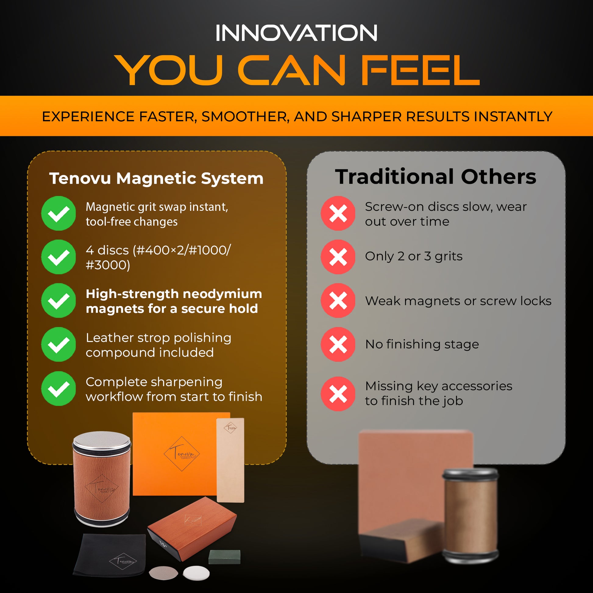 Bring professional-level sharpness to your kitchen with the Tenovu Supply Rolling Knife Sharpener Kit. Designed for home cooks and chefs alike, this magnetic rolling system delivers fast, consistent results without the mess or learning curve of traditional sharpening stones.